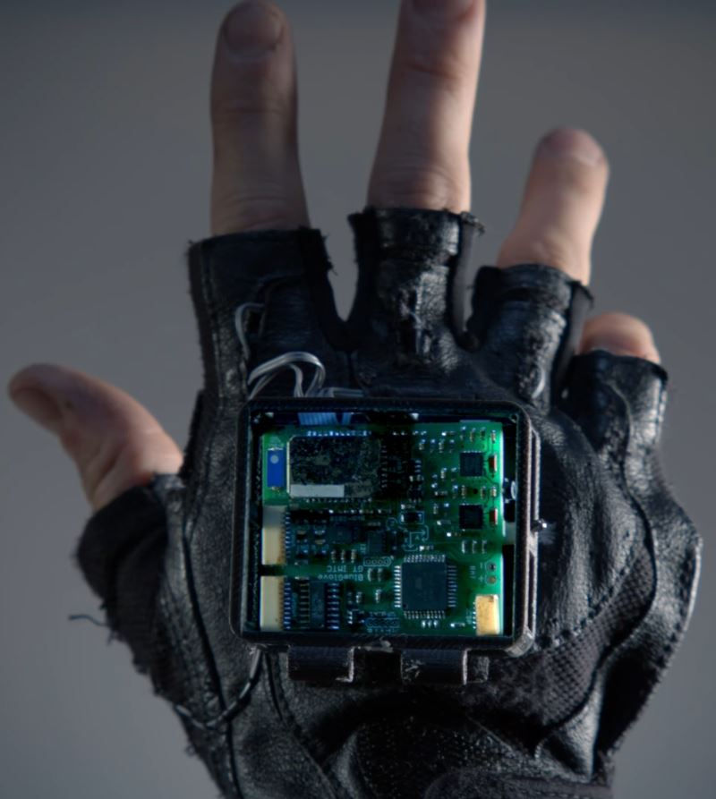 The circuit board on top is an Adafruit_L3GD20 connected to a ribbon cable that is connected to individual motors in the fingers.