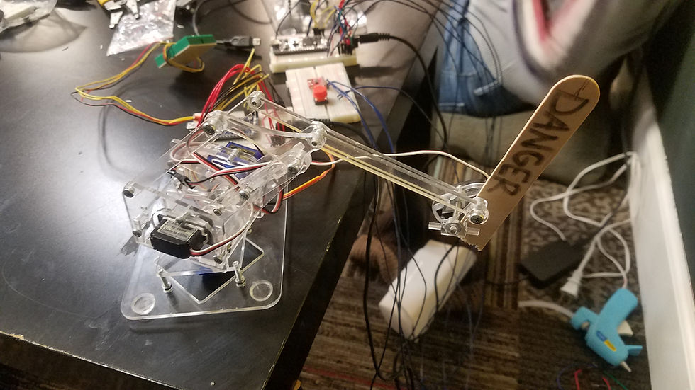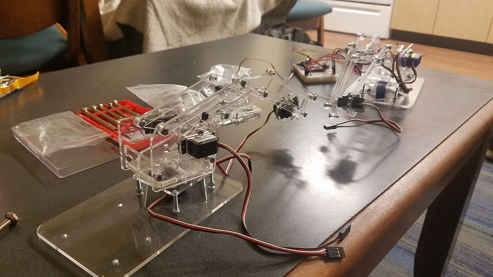 Yep! You read that right. SWORD. FIGHTING. ROBOT. ARMS. The future in now. These robot arms are controlled by a triple axis accelerometer connected to an ARM embed microcontroller. The arms are driven by 4 separate 9g servo motors that run off of an external power source. Me and my partner laser cut all of the pieces for the arms from acrylic. When turned on, the arms will go to their set home positions and wait for the LED light sequence to complete before listening to the accelerometer for control input. The button on the controller board is used to swing the sword. The objective is to try and pop your opponent's balloon. I made a great video showcasing these arms with a hilarious WWE spin on them. Go check it out in the video library!